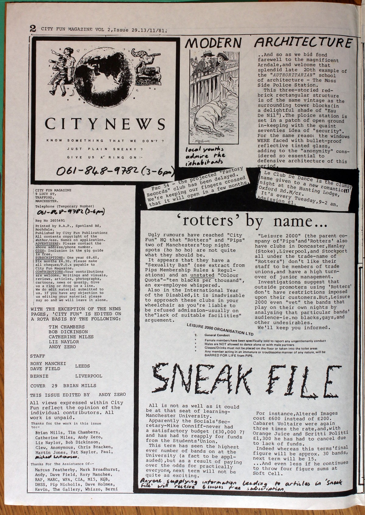 Gossip, hearsay and half-substantiated stories in the pages of City Fun may sometimes have been motivated by schadenfreude, but they often served a more noble purpose too. There's an example of that here, with the claim that the nightclubs Pips and Rotters operated semi or unofficial bans and restrictions relating to sexuality, race and disability and were hostile to trade union membership. This was ironic, given that the crowd tended to be a polysexual plethora of Bowie-clones, post-punks, goths and funk 'n' soul fans as documented in Nicholas Blincoe's novel Manchester Slingback and elsewhere on the MDMA website.