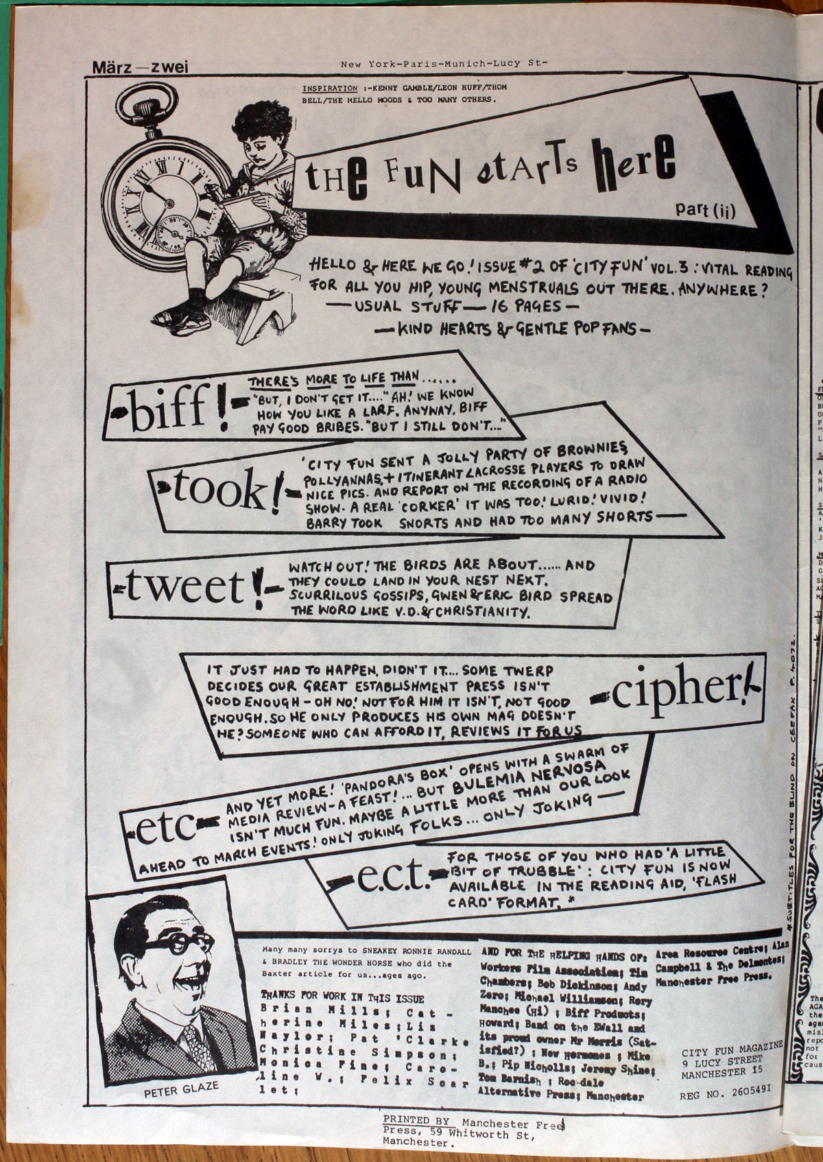 "New York-Paris-Munich-Lucy St": a wry, ironic reference to a wry, ironic song - the 1979 New Wave hit 'Pop Muzik' by M. The joke is clearly the anti-glamour of City Fun's inner city Mancunian HQ as opposed to the cosmopolitan glitter evoked by the song. Manchester's "hip young menstruals", however, were actually far more globally wired than they might have thought, with comparable DIY scenes around the world at the time.