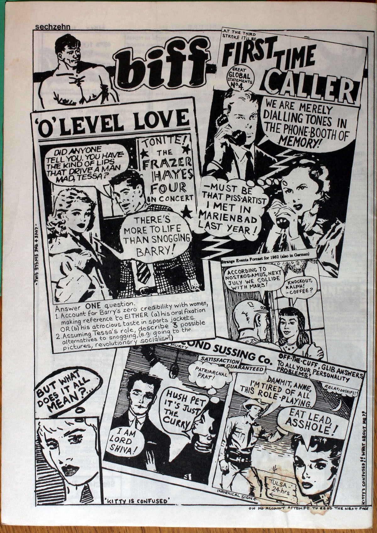 More countercultural continuity in the form of guest comic strips from Biff, a pair of cartoonists who rose with the underground press, whose work was stocked at Grassroots and Rough Trade and who like many other rebellious baby boomers, ended up contributing to the pages of the Guardian. The droll, bathetic love-hate relationship displayed in the comics with the avant-garde techniques on which they were based was in tune with City Fun's similarly tetchy descriptions of the music scene it facilitated, and its suspicion of pretension in all its forms. "'We are merely dialling tones in the phone booth of memory'...'must be that piss artist I met in Marienbad last year'".