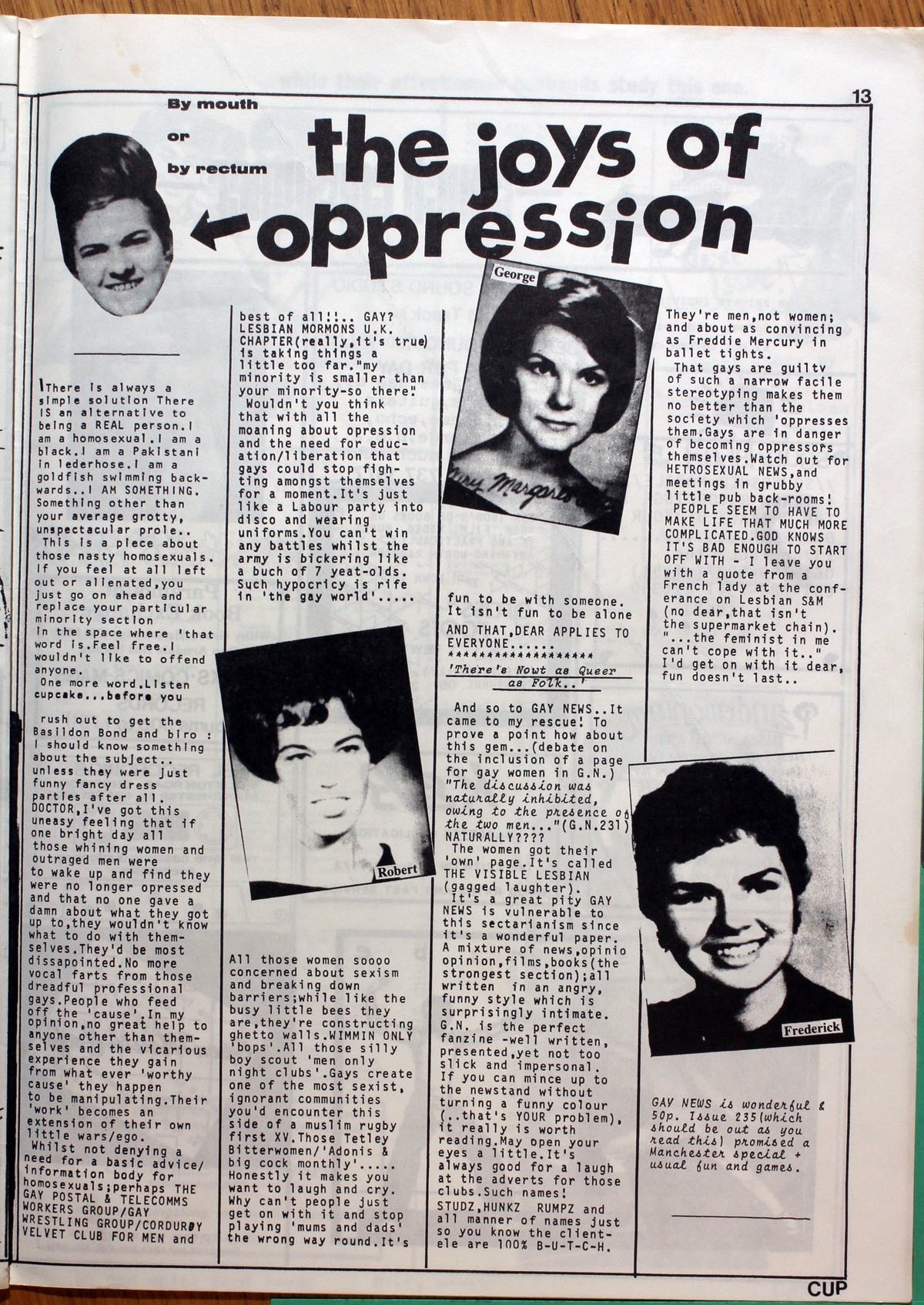 This magnificent rant against gay ghettoising-cum-celebration of Gay News may well have been written by either Liz or Cath: "Listen cupcake...I should know something about the subject...unless they were just funny fancy-dress parties after all." It's tartly perceptive and anticipates by a mile that scepticism which would arise later in the 80s about LGBT people being expected to be a certain kind of person with the same sorts of musical tastes, mannerisms and so on. When I first read it I thought it might be a too-hasty dismissal of gay politics, throwing the baby out with the bathwater in its raging against hypocrisy. Having scanned through it again, though, I realised that the unwavering political commitment is there. It's just been combined with an entirely reasonable anger at the way the goal of sexual liberation for all has given way to fragmentation and limited identity politics. It's not surprising that the author is a fan of Gay News, which grew out of the same radical 70s culture as City Fun. Gay News was preceded by Come Together, the underground paper of the Gay Liberation Front.