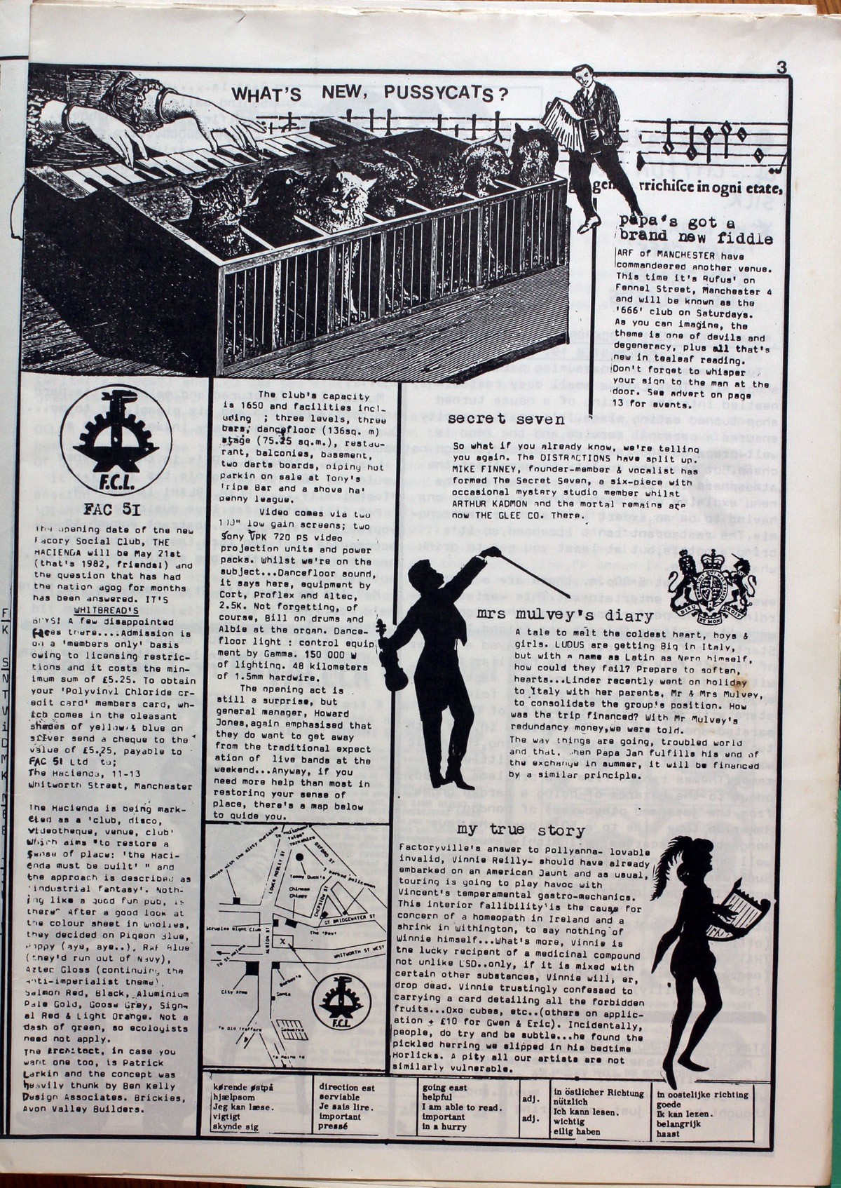 A report that the Hacienda is about to open. All must have been forgiven between Wilson and Naylor, since Liz was given the first numbered membership card for free. Old wounds were soon bloodily re-opened, however, with the Hacienda as battleground. In November 1982 Ludus headlined at the Hacienda. Linder, roused to feminist fury at the club playing soft porn "casually and interminably", enlisted the 'Crone Management' of Liz and Cath to aid her in a hysterical and splendidly grotesque piece of performance art. Before the set, the crones decorated the high end club interior with paper plates featuring a reddened tampon and a stubbed cigarette, handing out chicken gizzards wrapped in porn and handkerchiefs symbolising gay sexual fetishes. Linder, a vegetarian "prepared to be bloodied for protest", took to the stage in a dress made of meat (eat your heart out Lady Gaga) which she whipped back to reveal a dildo that she and Liz had purchased earlier before going for a cup of tea at Kendals. Ludus and Magazine keyboard player Dave Formula recalls Tony Wilson going "completely bananas."