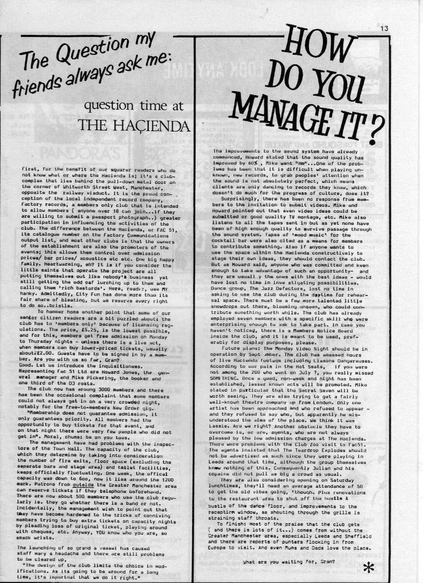 More Hacienda publicity combined with fraternal teasing in an interview with Howard Jones and Mike Pickering. The air of arch conceptualism which the club was going for is somewhat punctured by the mock 'fun for all the family' style of reportage adopted by the article's author: "Are you with us so far, Gran?"