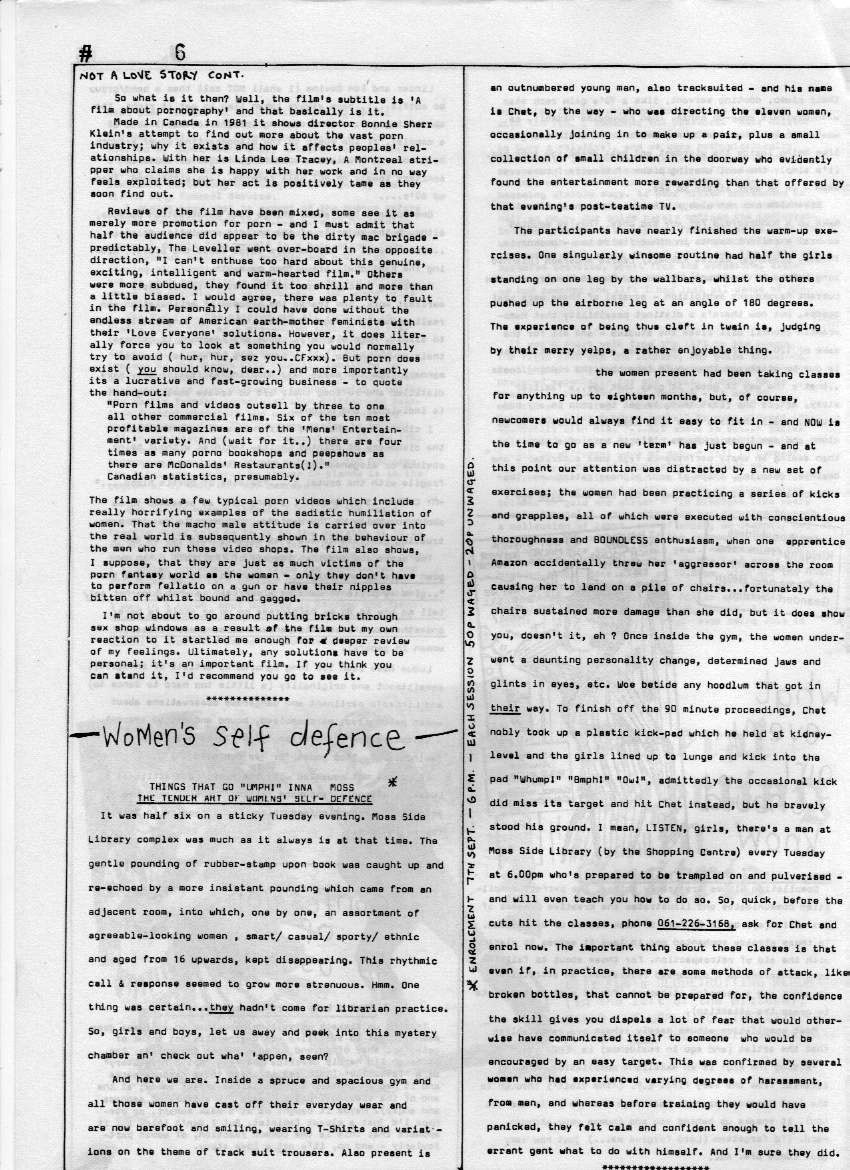 This review of a documentary on pornography and advert for a women's self defence class in Moss Side reveal one reason why that friendship between Ludus and City Fun existed: a shared commitment to women's rights.