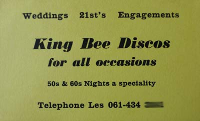 Les Hare's DJ business card from some point in the eighties. Les is the owner of Kingbee Records in Chorlton, one of the UK's best record shops.