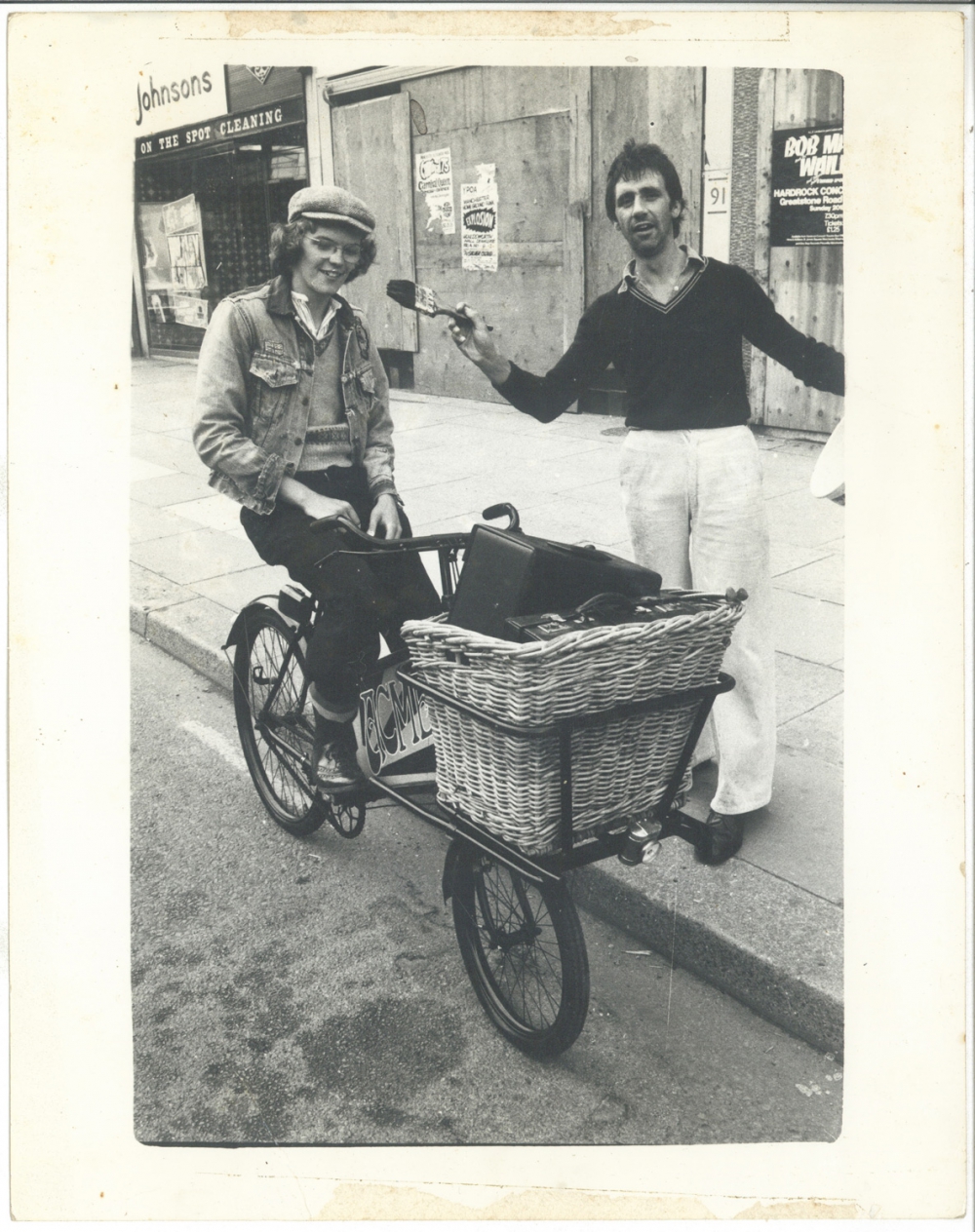 (Note poster for Bob Marley and The Wailers at The Hardrock Concert Theatre in the background. Also, a Carnival '75 poster on boarded up shop and a poster which says 'YPOA - Manchester's Home Grown Funk EXPLOSION at Houldsworth Hall, Friday 4th May'.)