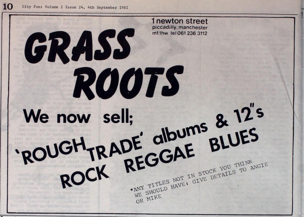 In 1981 Grass Roots bookshop - a place where you could buy political and left-of-field books, or get info on a variety of community activities, - started selling albums on the label Rough Trade, later home of The Smiths.