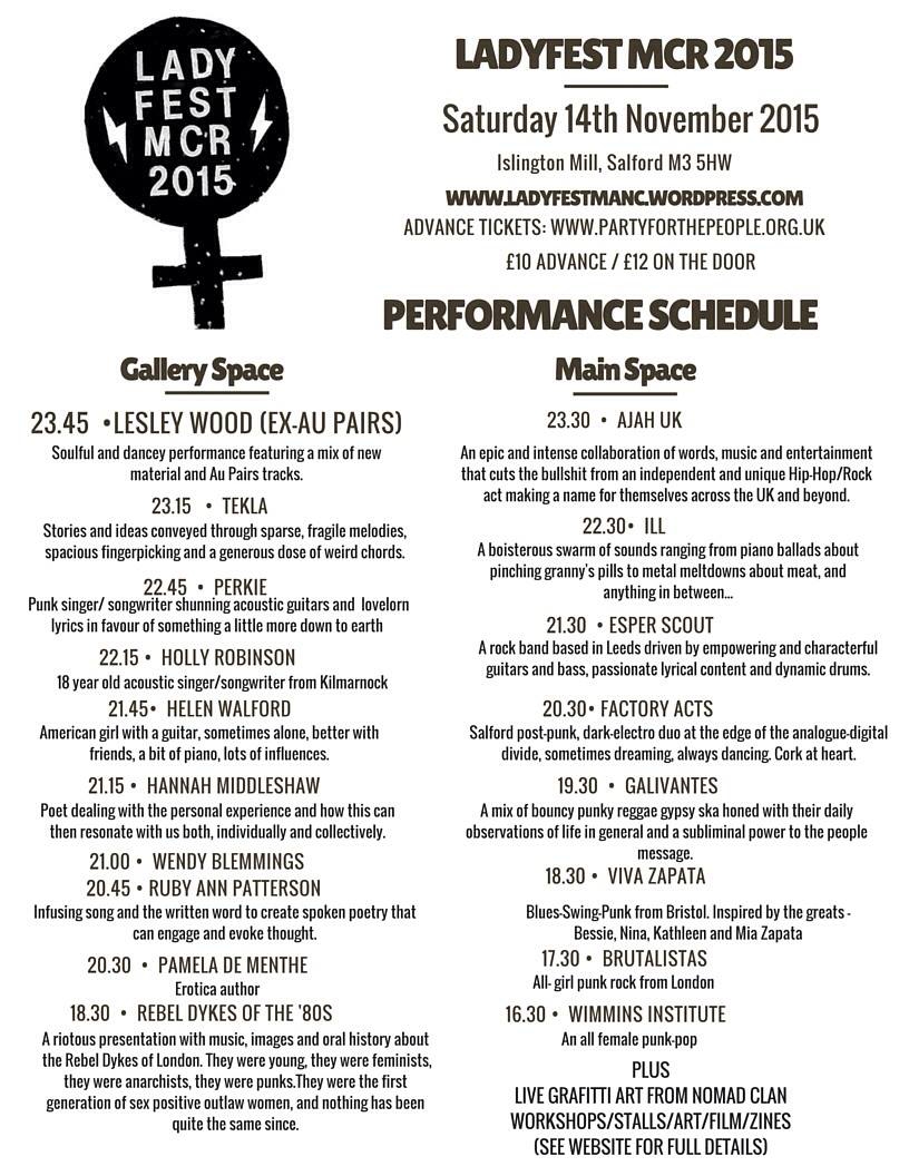 The line-up for this year's Ladyfest at Islington Mill, featuring the amazing Ajah UK and Factoy Acts.