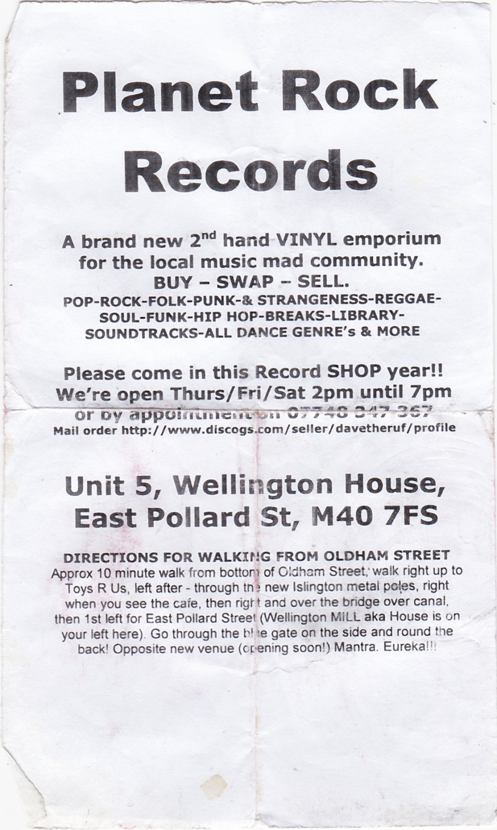 This a flyer for Dave The Ruf's Planet Rock Records on East Pollard Street. I haven't visited this shop yet, but I like the sound of STRANGENESS-REGGAE-SOUL-FUNK.