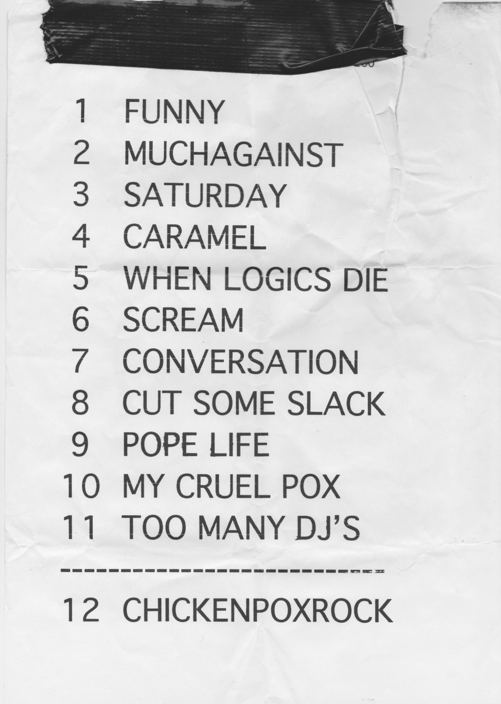 Setlist from Soulwaxs show at the MDH in 2000. We interviewed the band for the fanzine This Is Not TV and were due to speak to both the Dewaele brothers before the gig but David was instead joined by bass player Stefaan Van Leuven, and they explained that Stephen had chickenpox and would be resting up until showtime. The interview was good and the band were great when they played; Stephen was on vocals and you wouldnt have known that he was unwell from his performance. After the set I grabbed a copy of the setlist; partly to help us write the review but also because we had noticed that Stephens ailments had been incorporated into a couple of the song titles which we thought made the setlist a pretty cool thing to have.