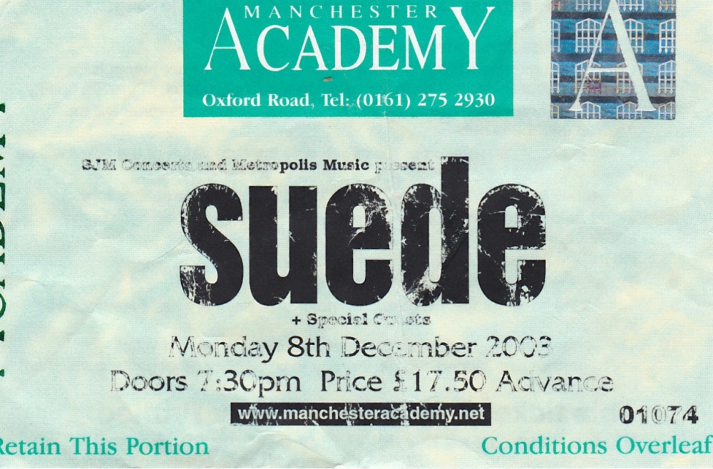 Back in 2003 I saw Suede at Academy 1. I hadnt intended to. My passion for the band had receded by that point and I didnt think thered be much to discover, but the enthusiasm of a younger colleague at Vinyl Exchange - the record shop I worked in then rubbed off on me throughout the day. By closing time Id vowed to chance my arm with a tout. The band had, after all, announced that they were splitting, and this would be the farewell tour.