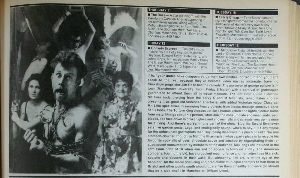 Fresh from grossing out the Lollapolooza crowds, The Jim Rose Sideshow Circus rolled into town on a wave of red top media hoo-hah due to the 'sick' nature of the show. This article states that sick bags were included in the £8 admission!