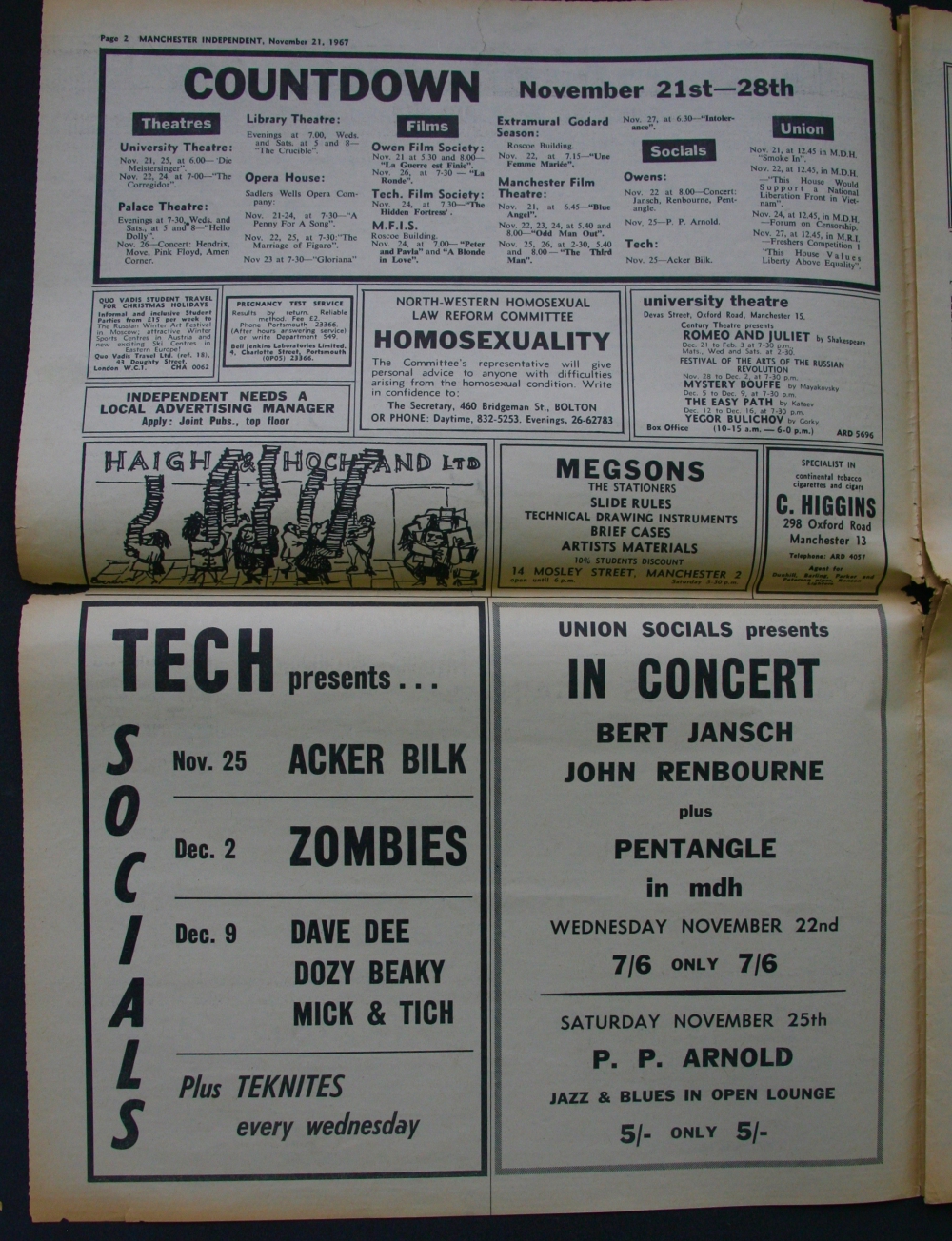 UMIST has Acker Bilk, The Zombies and Davy Dee, Dozy, Beaky, Mick and Tich, whist over at MDH, legends of the folk scene, Jansch, Renbourne and Pentangle were visiting. Soul star P.P. Arnold was bringing up the rear at MDH, with more jazz and blues promised at the Open Lounge.
