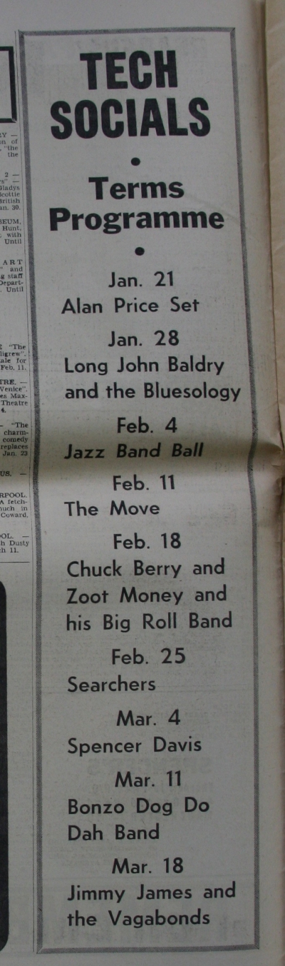 A sterling line-up, including Spencer Davis, Bonzos and Jimmy James, for the Tech Union's early gigs of 1967. Were the financial wobbles of '66 behind them?