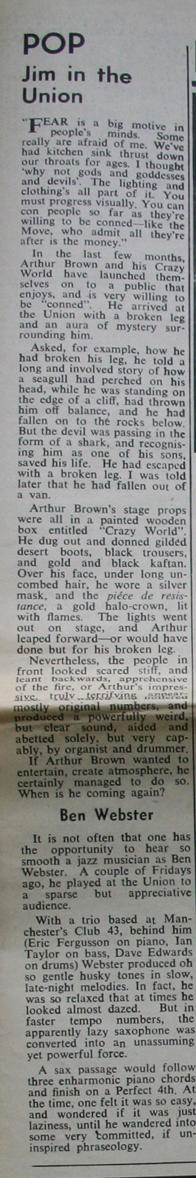 Arthur Brown of 'Fire!" fame brings his deranged brand of psyche-rock to the Union, replete with a broken leg, which he claimed was caused by a seagull-related accident.