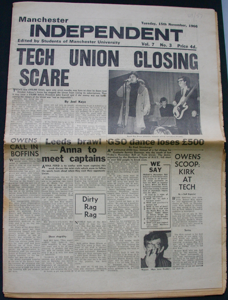 The November Ball at the Tech (featuring the Mindbenders, St Louis Union, Freddie and the Dreamers and a surprise appearance from Beach Boy Bruce Johnston) is also described here as a 'debacle' due to the fact that it made a loss of £500. '60 couples and 42 wallflowers wilted to the strains of the St Louis Union', the piece states.