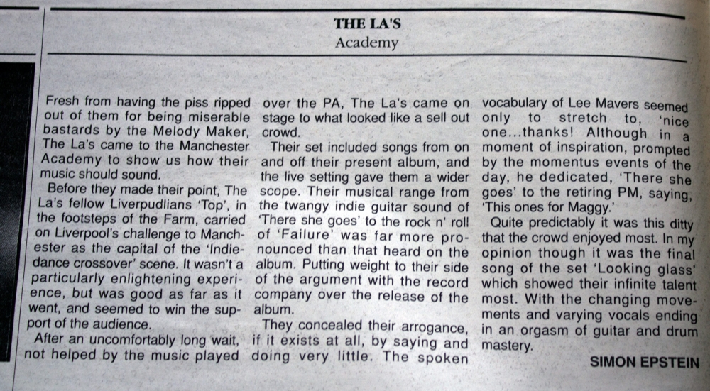 A review of The La's visit to Academy 1 whilst they were riding a wave of popularity with the critically acclaimed self-titled debut album and chart bothering indie disco staple 'There She Goes'.