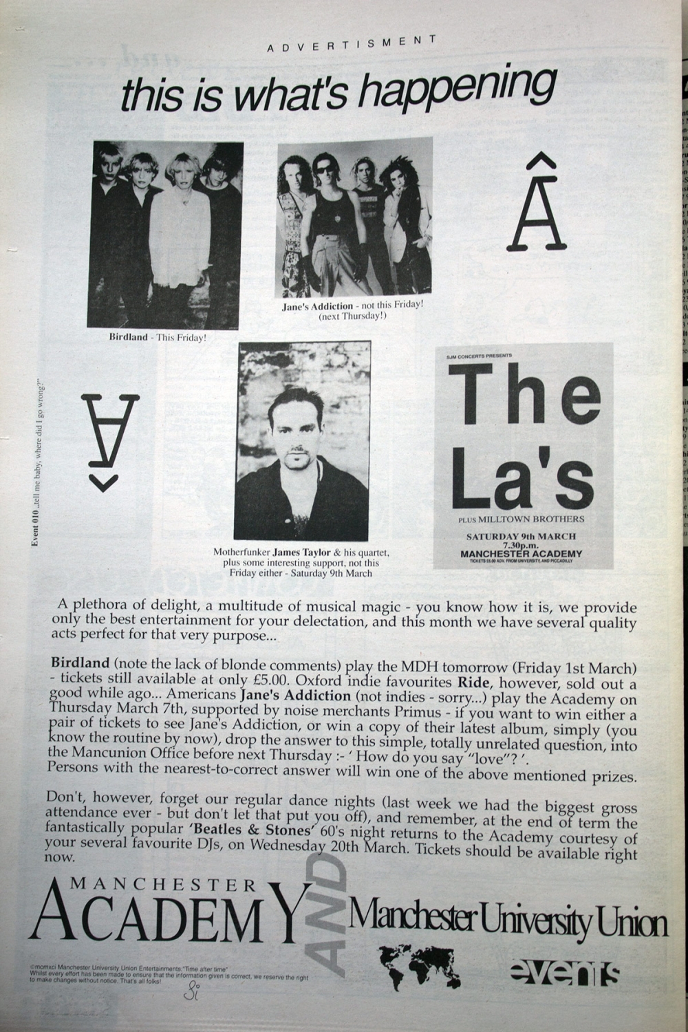 This advert promises readers a 'A plethora of delight; a multitude of musical magic' for gigs coming up in early March 1991. I wholeheartedly agree with this statement - just look at some of the names who are playing ... Jane's Addiction imploding on their magnificent Ritual De Lo Habitual tour, Ride returning for another show on the Nowhere tour as well The La's and JTQ.