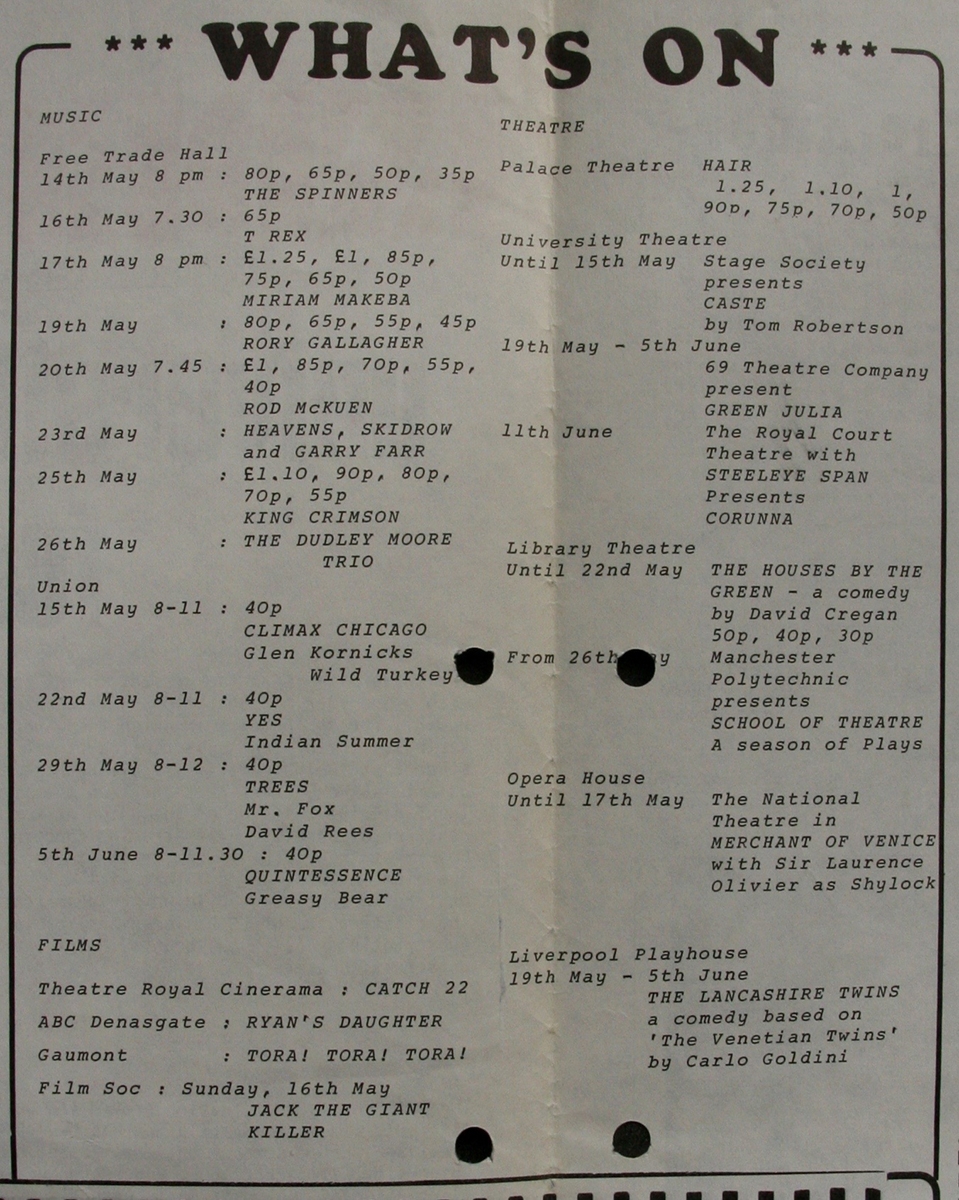 This what's on guide provides a good insight to the entertainment scene across the City at the time and features Main Debating Hall gigs by Quintessence + Greasy Bear, Yes and Trees. Also playing across the City were T-Rex, The Spinners, Rory Gallagher and King Crimson amongst others.