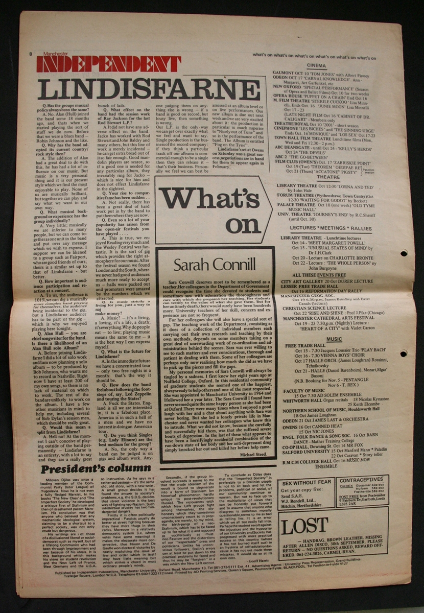 Taken from the Manchester Independent Newspaper, written and edited by University of Manchester students. With thanks to James Peters at the University of Manchester Archives and Ben Ward at The University of Manchester Students' Union.