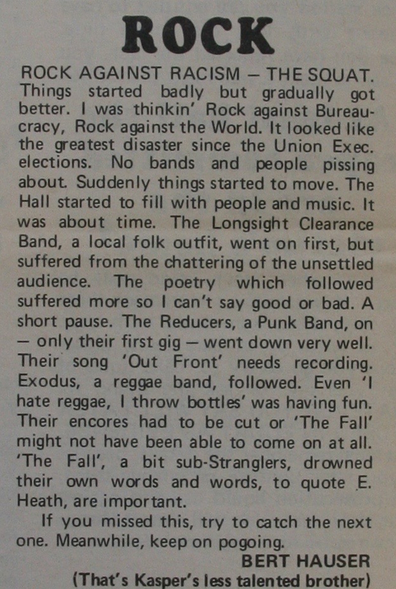 A review of the annual Rock Against Racism show with local line-up including The Fall, Exodus and The Reducers.