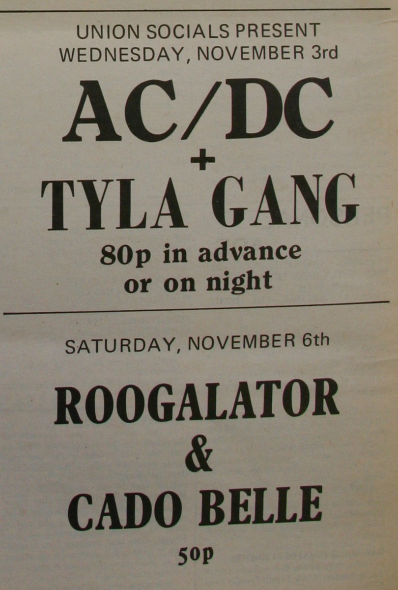 Terrific advert featuring an AC/DC show in the Main Debating Hall, the band were on a UK tour promoting their Dirty Deeds Done Dirt Cheap album. The ticket price was a mere 80p.