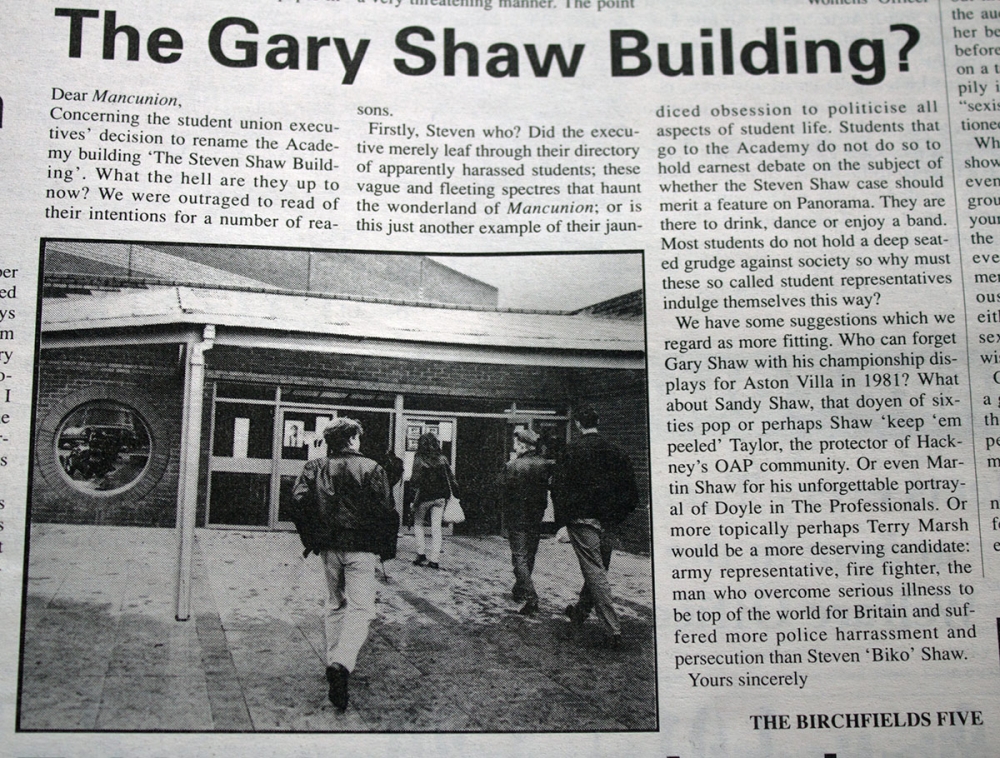 A reader's letter concerning the Council's decision to rename the Academy 'The Steven Shaw building'. Steven Shaw was a Manchester University student who suffered police harassment during the final days of the miners' strike and fled the country in 1985.