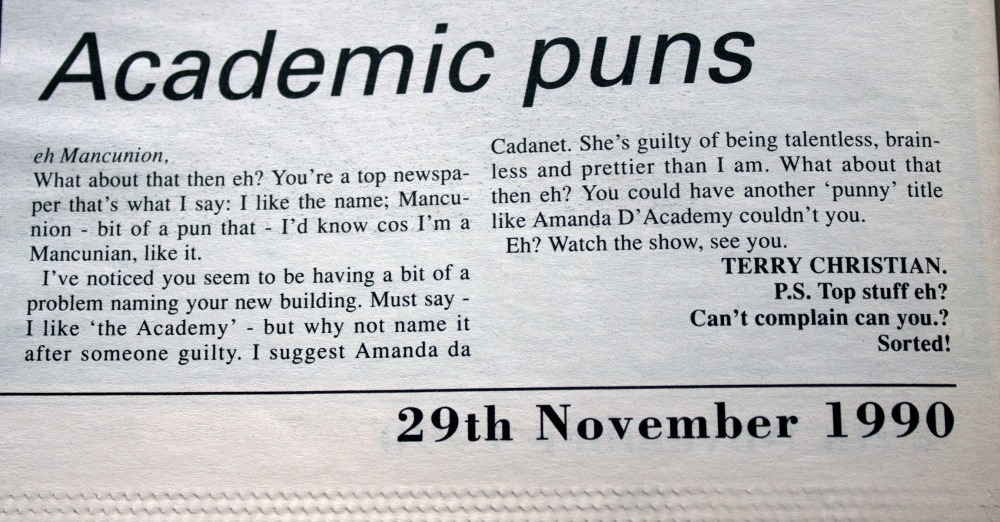 Broadcaster and journalist Terry Christian (not verified) writes with his tongue planted firmly in cheek with a letter regarding the proposed name change of Manchester Academy. His suggestion is Amanda D'Academy in homage to his co-presenter from the brilliant Channel 4 TV show The Word (Amanda De Cadet).