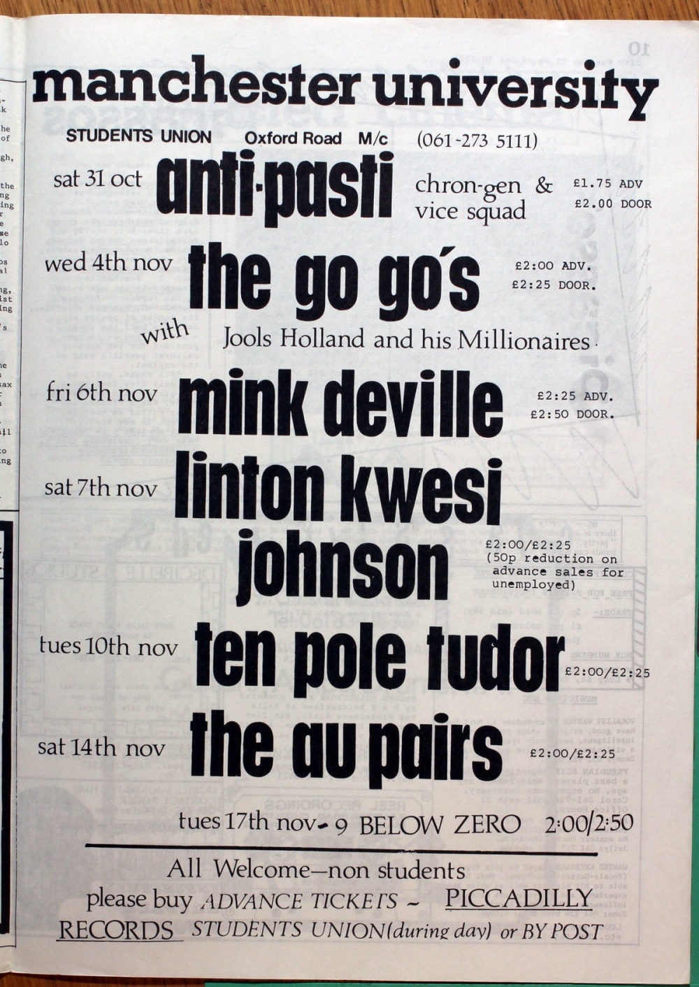 Shows over two week period in October 198 included dub poet Linton Kwei Johnson, pop queens The Go Go's and a refreshed line-up of Mink DeVille.