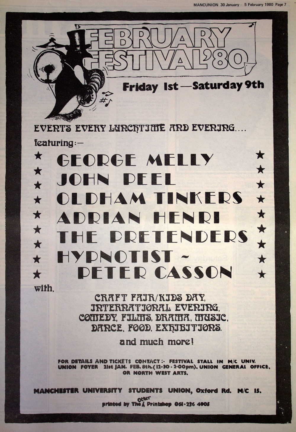 A cracking listing advert for the week long February Festival 1980 with diverse line-up featuring chart toppers The Pretenders, jazz and blues from George Melly's Feetwarmers, poetry by Adrian Henri, a hypnotist and the John Peel Roadshow amongst others.