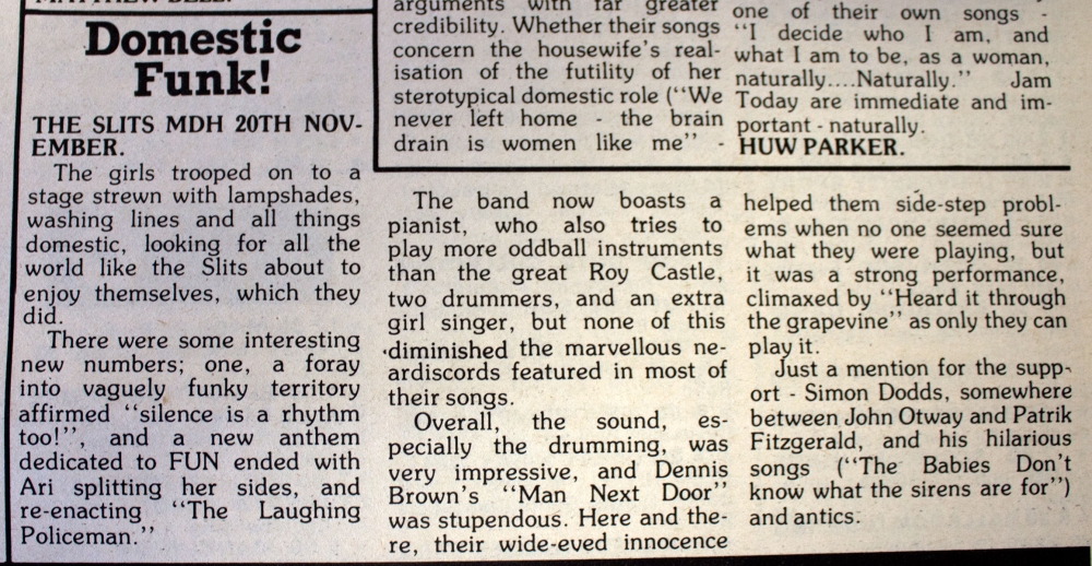 Review of The Slits joined onstage by an extended line-up of musicians. I love the description of the stage set up featuring lampshades, washing lines and all things domestic, a tonge-in-cheek stiff middle finger to the misogynist punk rock assholes.