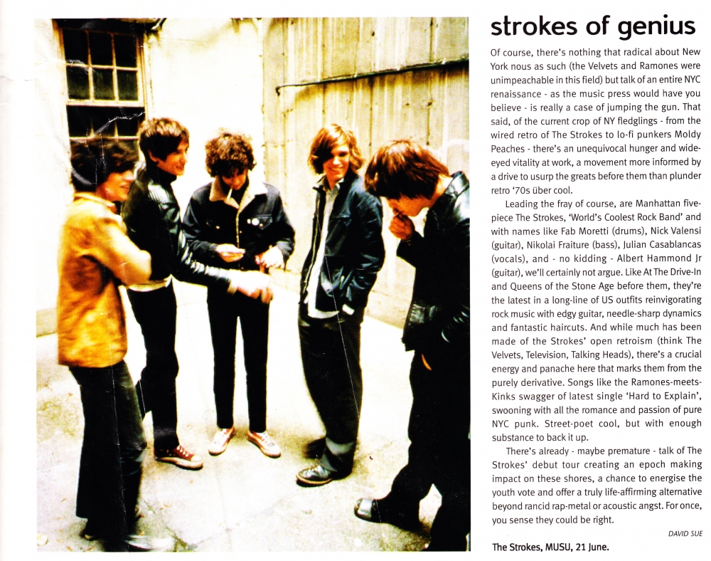 Mini feature on The Strokes on their debut tour of the UK, tipping them to be the next big thing and ahead of the release of their debut album "Is This It".