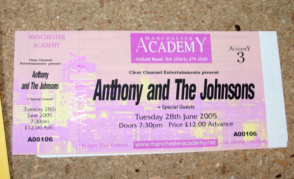 Unused gig ticket for Antony and the Johnsons (ticket is spelt Anthony). The show took place just a few months before winning the Mercury prize in 2005 for her album I Am A Bird Now, beating the likes of Coldplay, MIA and Bloc Party.