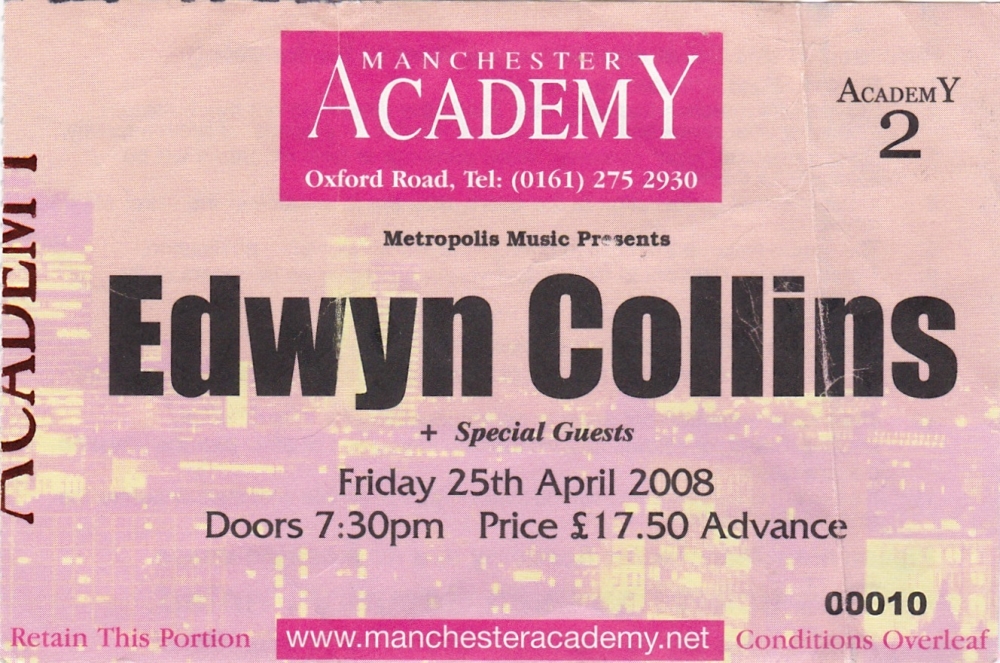 This was Edwyn's first post-stroke tour. We didnt know what shape hed been in, although he'd recorded a nice album. Went down and it was a really beautiful performance. Unbelievable response. Edwyn walked on stage very slowly aided my his wife, Grace Maxwell. Everyone was so thrilled to see him on stage. He played with his son. Since his stroke his syntax is very different, but he can still communicate well. His material was great.