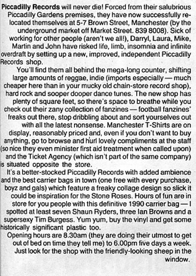 an article about the move to Brown St by Piccadilly Records. The shop moved to it's current location on Oldham Street after the IRA bombing...