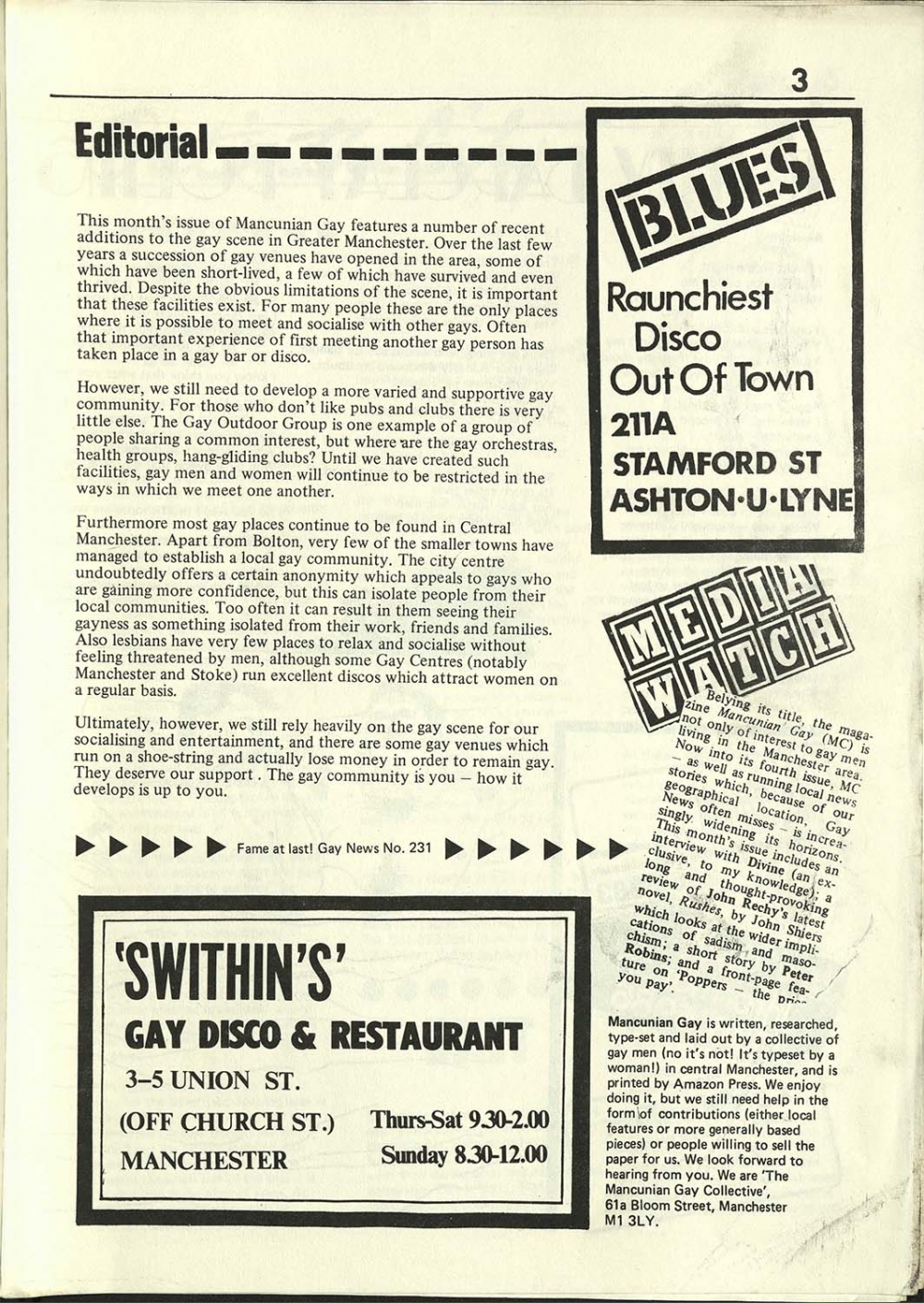 Advert from Swithin's Gay Disco and Restaurant 1982, taken from The Mancunian Gay magazine.