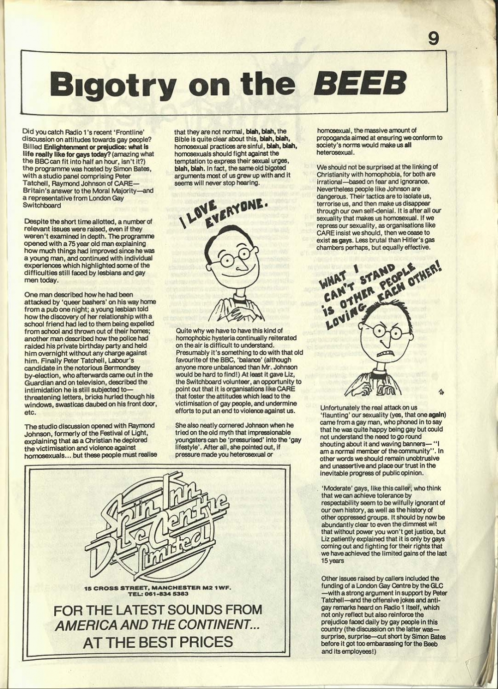 Advert for Spin Inn, 1983. Spin Inn was a key influence on the music played in Manchester's gay clubs at this point. As import specialists they were able to access the US disco and hi-NRG 12" records that the gay crowds craved.