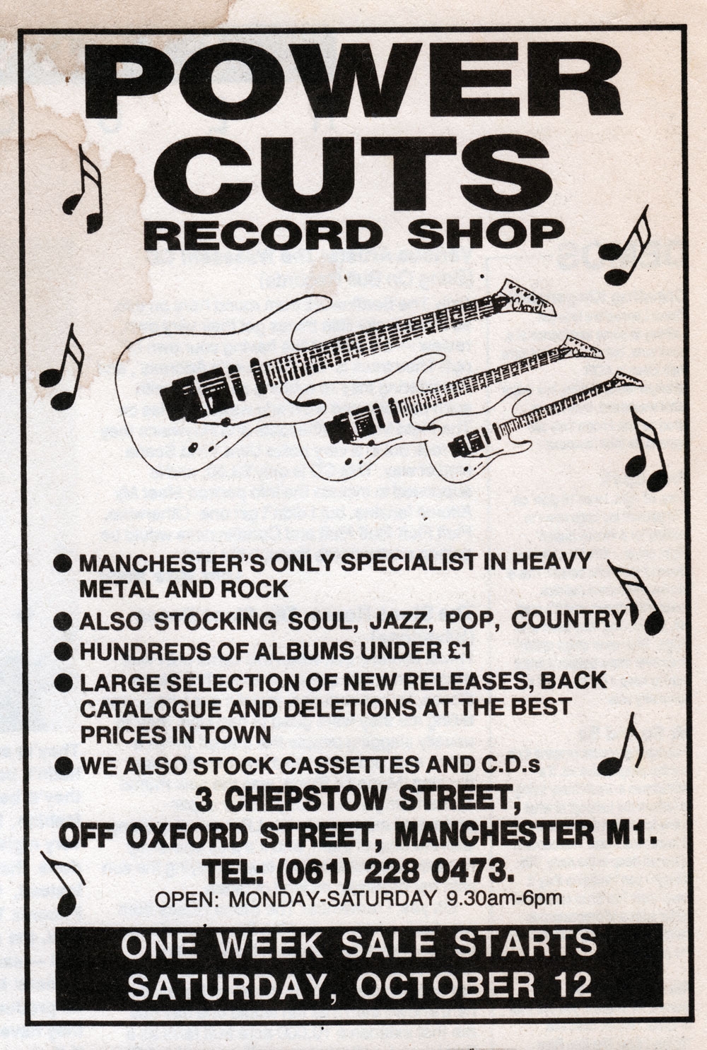 Advert for Power Cuts Records. Manchester's premiere source 'cut out' and remaindered records. I still have a Devo LP from there. 49p. Bargain.