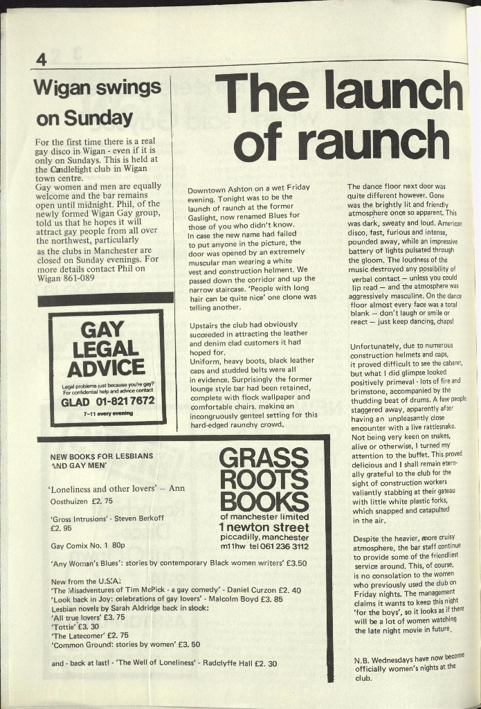 A press article in Mancunian Gay, 1981 covering the opening of BLUES in Ashton, a leather/uniform club for gay men that took over from the Gaslight, a club opened for women by Joyce Edwards in 1973. We also see an advert for Grass Roots Books - a vital hub for the political queer community Manchester, plus news of a gay night in Wigan.