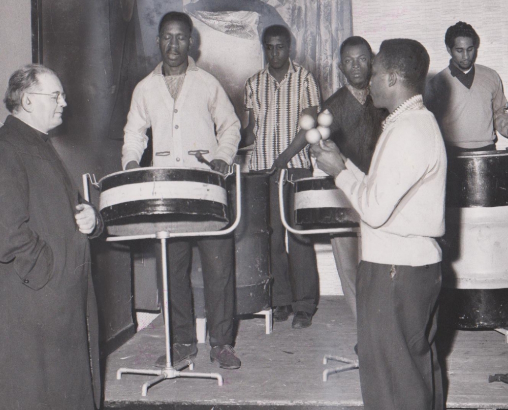 Father Michael Walsh listens to the Lagos Lagoon Club Steel Band in Moss Side. Photo that accompanied a piece on Moss Side in the Daily Mail on November 21st 1961