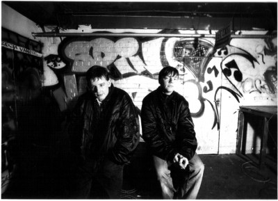 Photo of Andrew Barker and Darren Partington.arriving in Eastern Blocs basement obviously after a rainstorm.