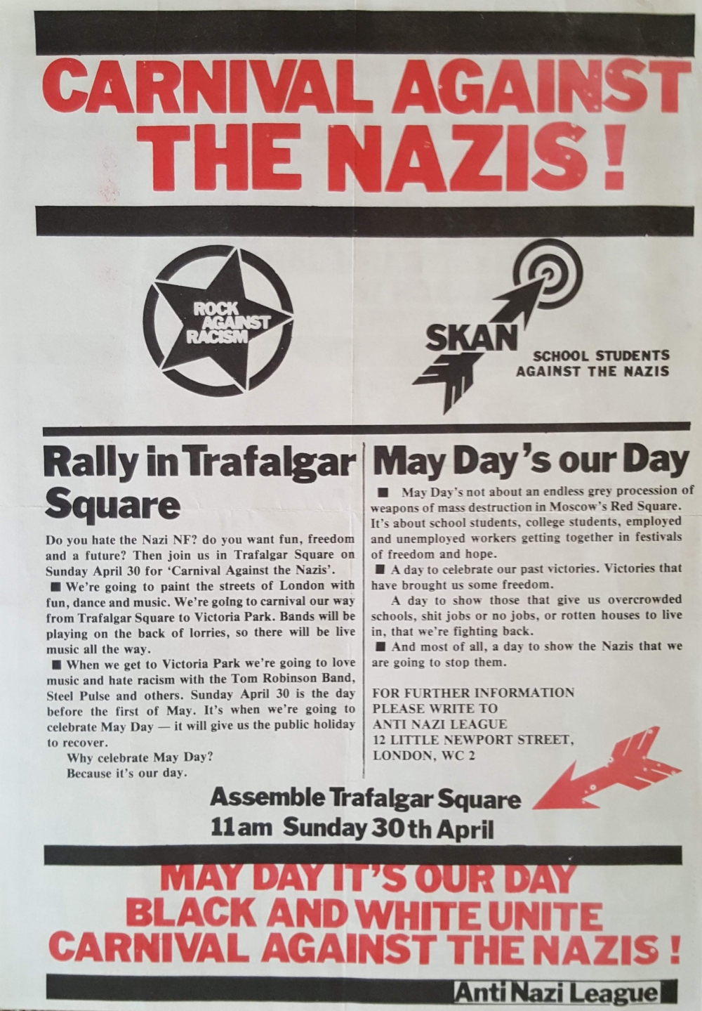 Flyer for the first ever Anti Nazi League and Rock Against Racism Carnival held in London's Victoria Park, featuring the Clash, Steel Pulse and X-Ray Spex. It was this initial event that led to the Northern Carnival in Manchester just 10 weeks later.