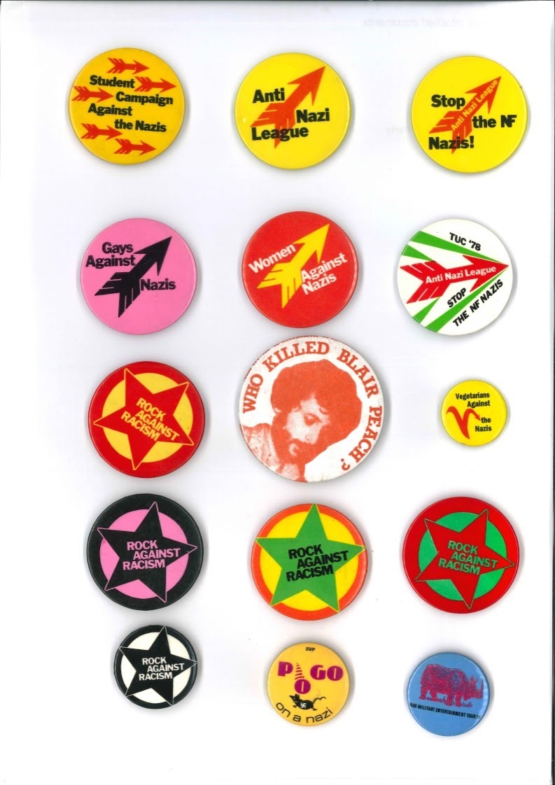 A set of Anti Nazi League and Rock Against Racism badges linked to MDMArchive's Northern Carnival Against the Nazis 40th Anniversary' exhibition, held at Niamos (old Nia Centre) in Hulme in September 2018.