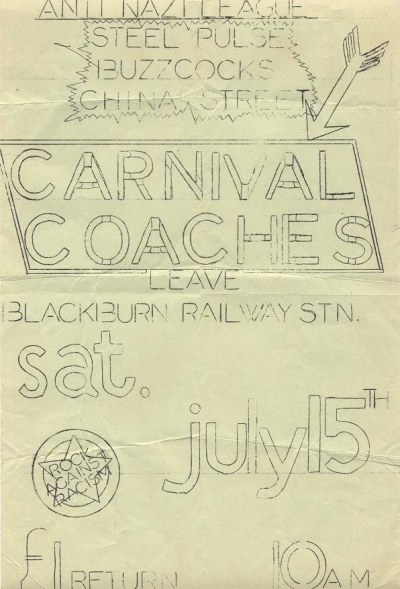 Co-organised by Geoff Brown of the Anti-Nazi League (ANL) and Bernie Wilcox of Rock Against Racism (RAR), the Carnival featured incendiary live performances by pop-punk superstars Buzzcocks and Steel Pulse, the UK's leading reggae band of the period. Support came from Moss Side reggae band Exodus (later X-O-Dus) and China Street from Lancaster, who had released a single on EMI called ?Rock Against Racism?.