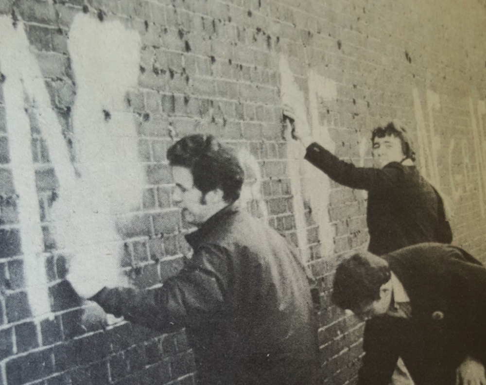 A photo of Anti Nazi League activist Geoff Brown - one of the driving forces behind the Northern Carnival 1978 - scrubbing our racist graffiti.