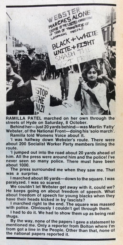 In October 1977, National Front leader Martin Webster staged a one-man march in Hyde, protected by an estimated 2,000 police officers. A counter-protest was carried out by 20-year-old Ramila Patel of Bolton Asian Youth Movement, who walked in front of Webster carrying a placard that read (on the rear): This man is a Nazi. Ramila managed to walk about 80 yards before a policeman grabbed her placard and broke it in half.