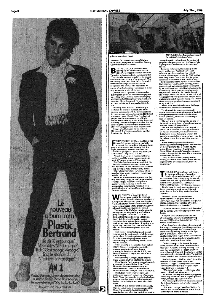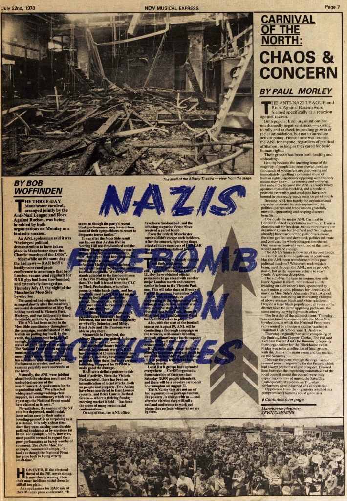 The NME review of the Northern Carnival Against the Nazis, featuring a funny comment from Buzzcocks manager Richard Boon.