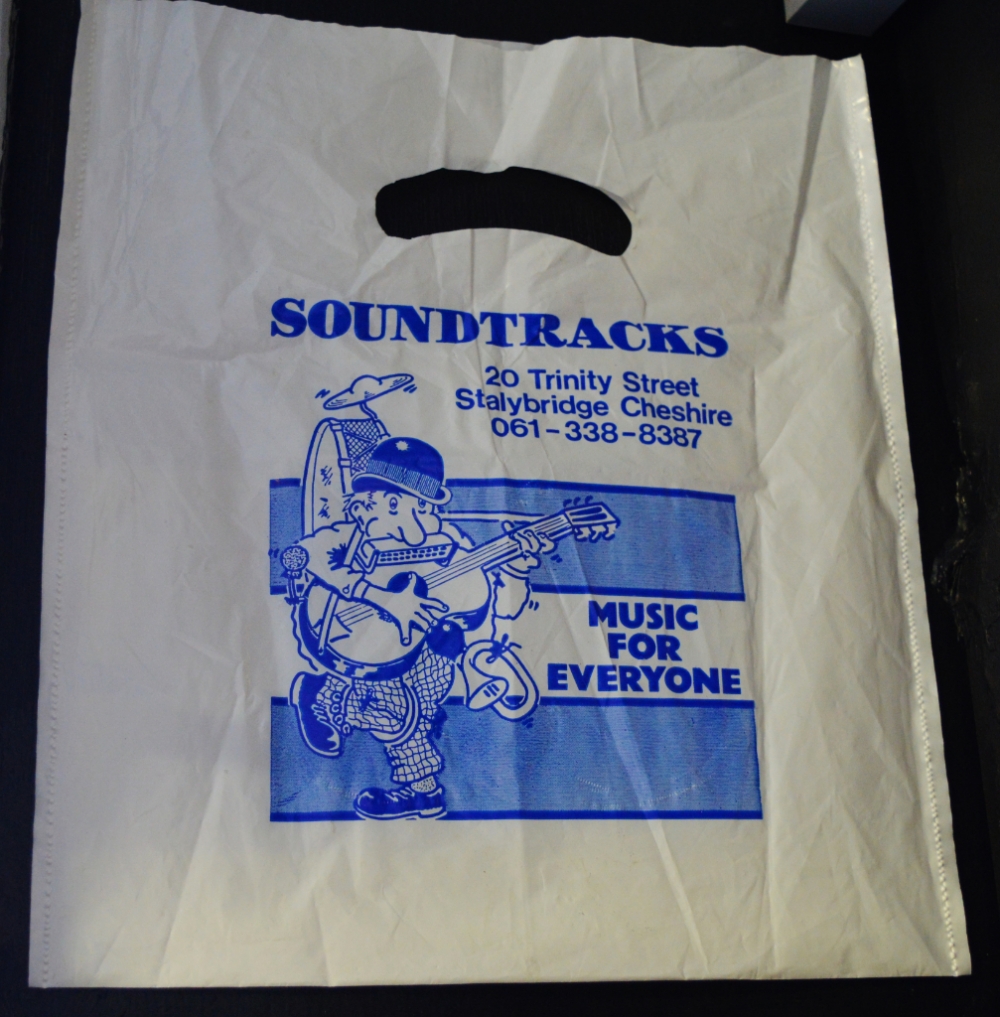 Seen in Vinyl Resting Place: a carrier bag for Soundtracks, in Stalybridge, Cheshire.