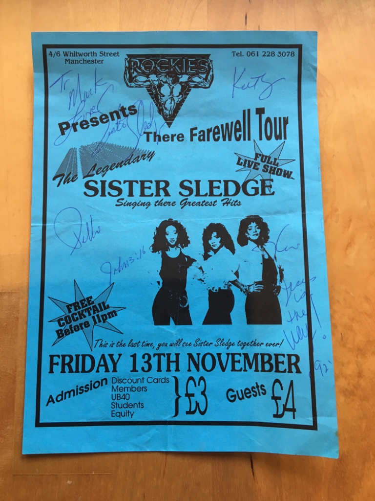 Mark Hutchinson was very proud of this flyer as he had approached Sister Sledge at the end of the gig and the 3 sisters and the supporting musicians had all signed it.