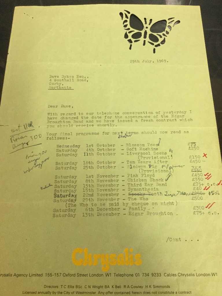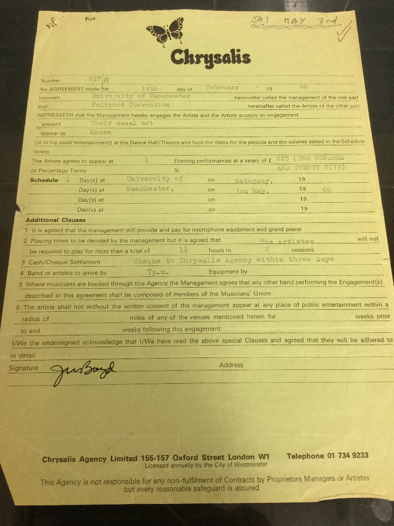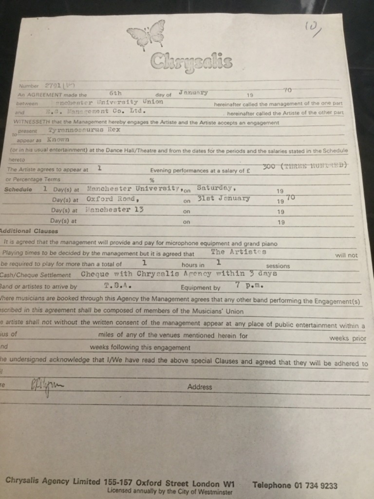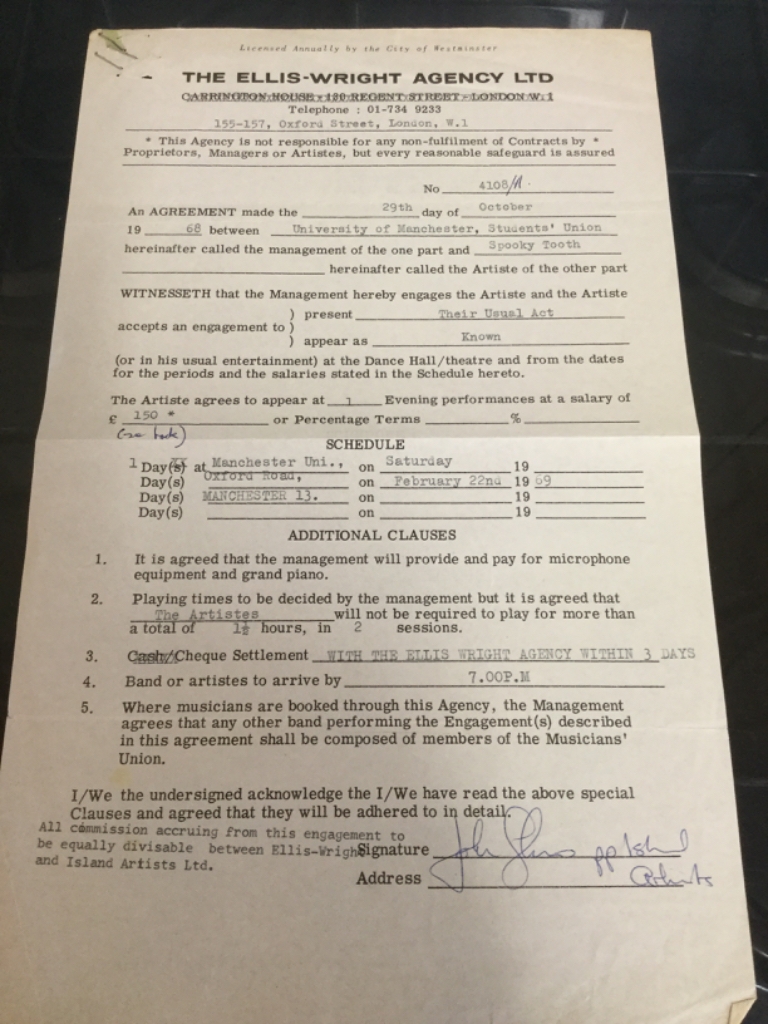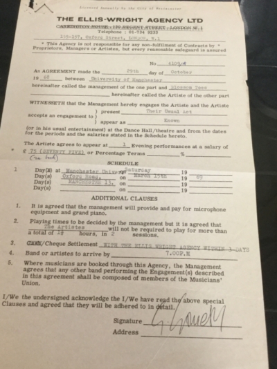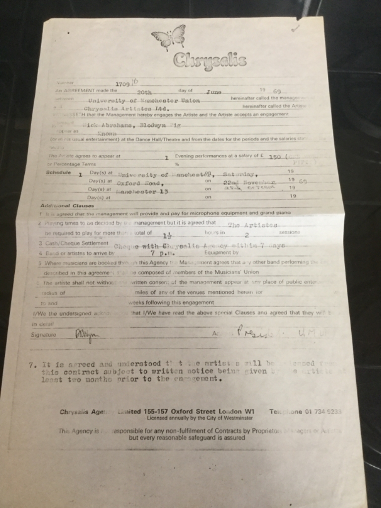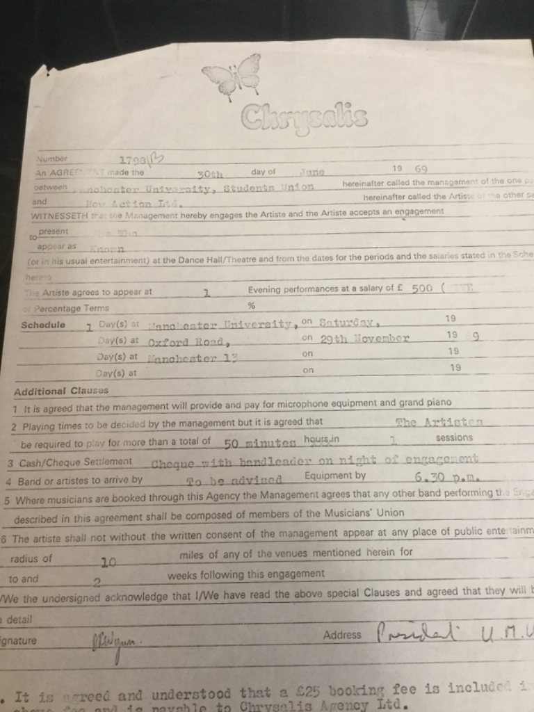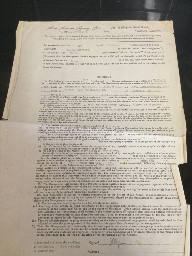 My late uncle Dave Sykes was Social Secretary at Manchester Students Union in 1969 / 70 I believe. I gather he graduated a few years later. As he enjoyed being the social secretary so much. He came from Northamptonshire in the 1960s and made Manchester his home. He ended up as an FE lecturer at City College and resided in Didsbury until his passing in 2009. I sadly no longer have the originals and these are the only photos of the contracts I have. Dave always said the best band he booked from a live performance perspective was Slade...Hope of interest to the archive...Gary (Daves nephew)