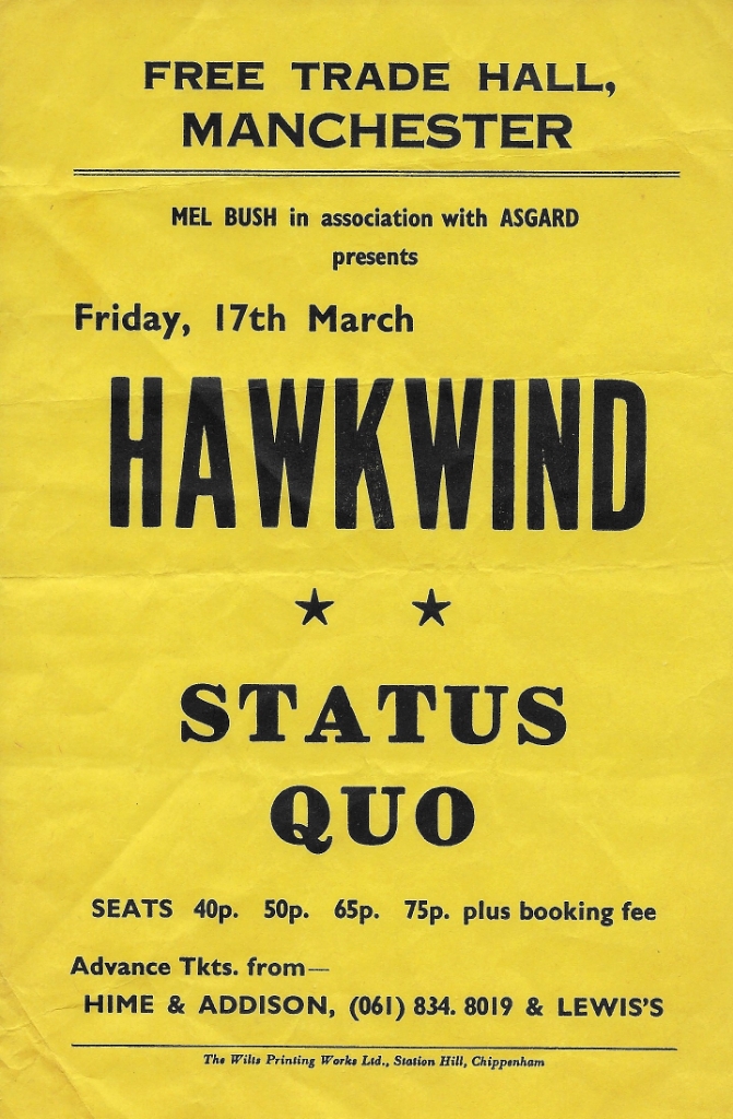 Free Trade Hall flyer from my first Hawkwind concert with support..Status Quo. The FTH Box Office had lots of flyers like this one from rock bands visiting this famous hall in Manchester like The Faces, The Groundhogs, Curved Air, etc.